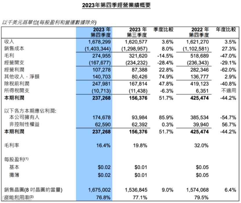 2月6日晚间,芯片代工龙头——中芯国际披露了2023年四季度财报。其中显示,公司上季度营收16.78亿美元,略高于指引,较去年三季度的16.2亿美元环比增长3.6%;上季度毛利率为16.4%,符合指引;实现净利润1.747亿美元,超出分析师预期的1.486亿美元。