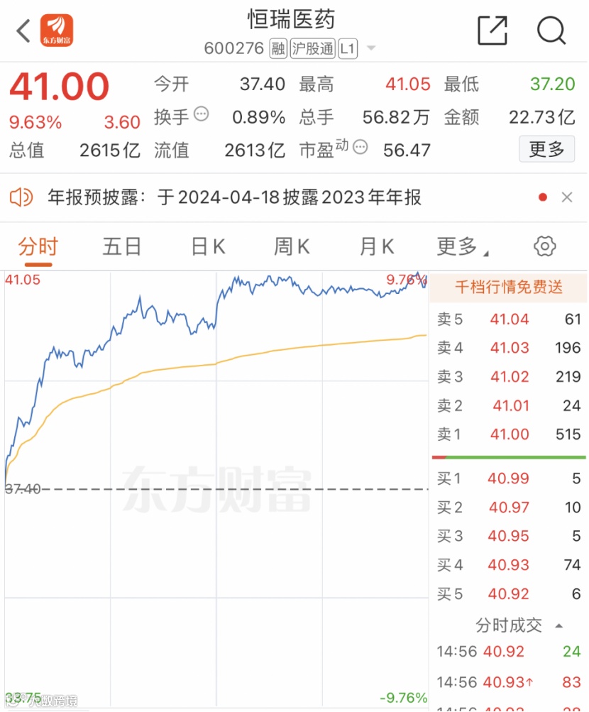 2月6日收盘,恒瑞医药股价大涨9.63%,报41元,最新总市值达2615.4亿元。