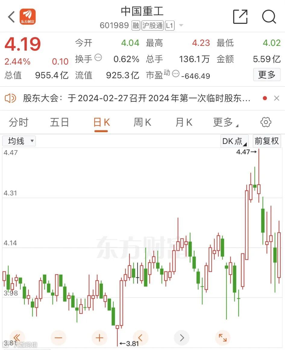 截至2月6日收盘,中国重工涨超2%,报4.19元,最新总市值达955.4亿元。