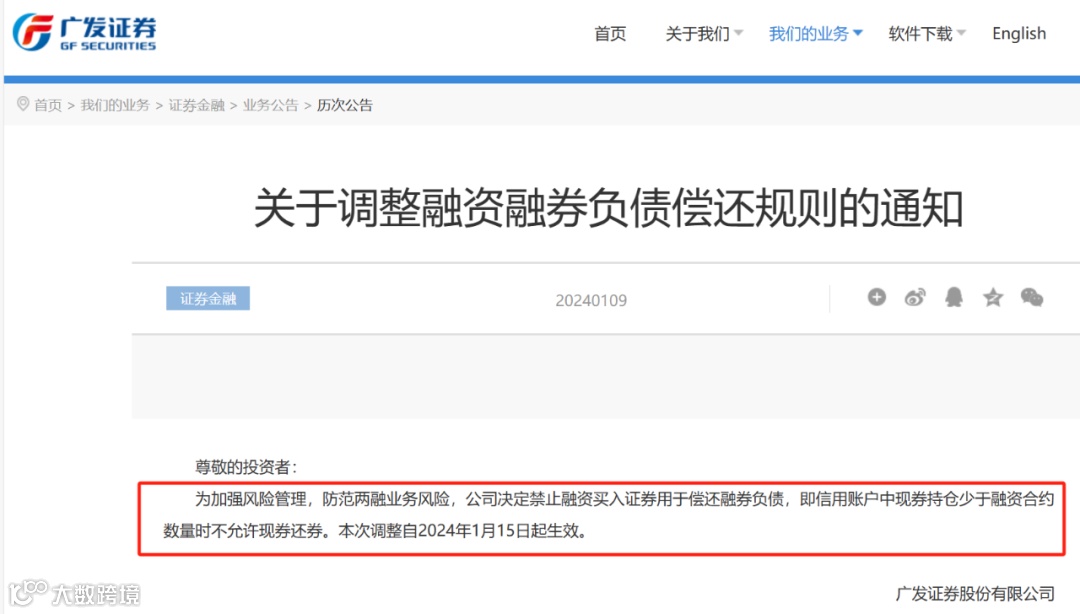 广发证券表示,公司决定禁止融资买入证券用于偿还融券负债,即信用账户中现券持仓少于融资合约数量时不允许现券还券。此次调整自2024年1月15日起生效。