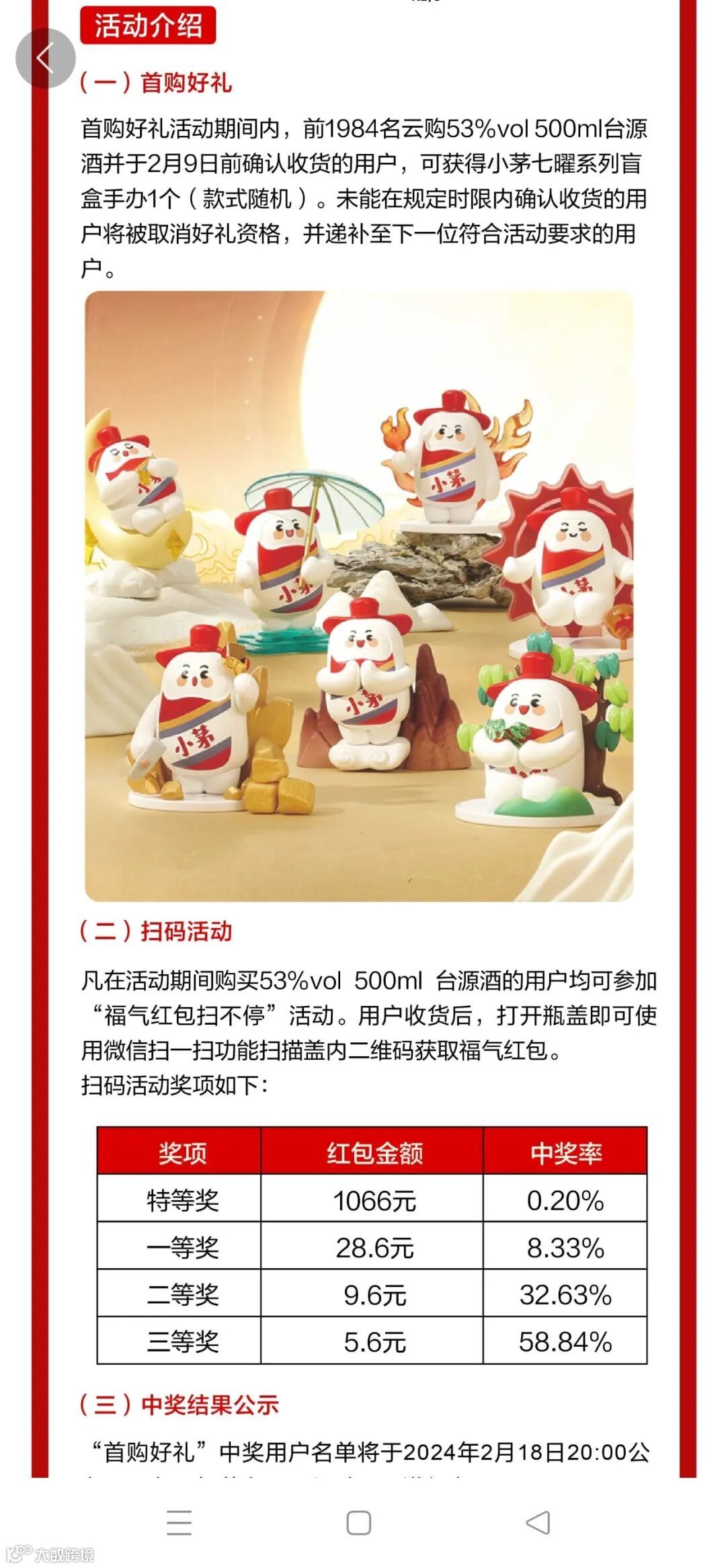 1月27日,台源酒正式在i茅台上线,仅用了17分钟,首日投放的1800瓶售罄。记者从i茅台APP获悉,为了进一步促进台源酒销售,让更多的消费者感受到“台源之美”,茅台保健酒业公司还规划了配套两大活动:一是活动期间,茅台保健酒业将为前1984位下单的消费者提供专属赠品;二是台源酒将通过扫码活动给消费者放送红包福利。