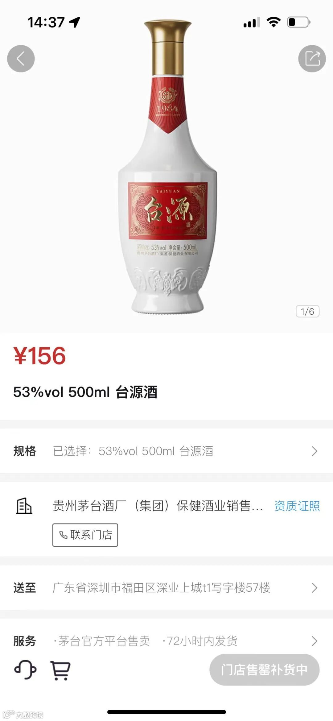 28日下午,台源酒再次上线i茅台,记者所在的深圳地区约半小时已显示售罄。