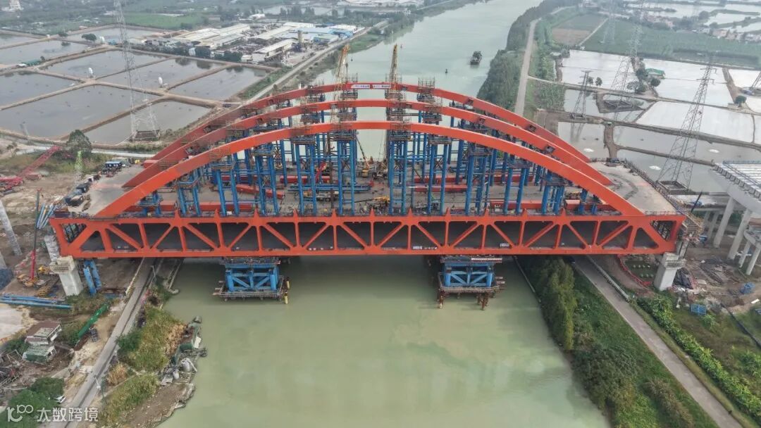 其中,黄沙沥特大桥是国内最大跨度的简支双层三主桁钢桁梁拱桥,南北走向横跨黄沙沥水道,主跨长达202米,桥面总宽45米,全桥用钢量达11106吨。