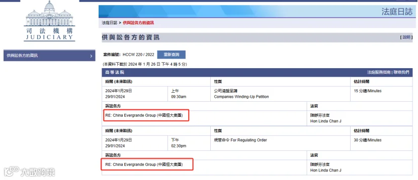 1月26日,据中国香港司法机构网站,香港高等法院将于2024年1月29日9时30分举行针对中国恒大集团的清盘呈请聆讯。同时,法官陈静芬将于下周一下午2时30分就一项潜在的规管命令举行聆讯。