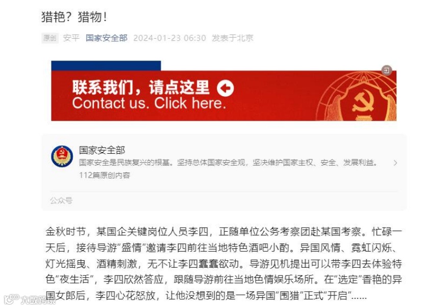 1月23日,国家安全部披露的一起案件,引发网络关注。在一篇题为《猎艳?猎物!》的文章中,国家安全部提到,某国企关键岗位人员李四,随单位公务考察团赴某国考察期间,跟随导游前往当地色情娱乐场所,后被间谍拍“艳照”威胁策反,沦为傀儡。目前,李四已被依法逮捕。