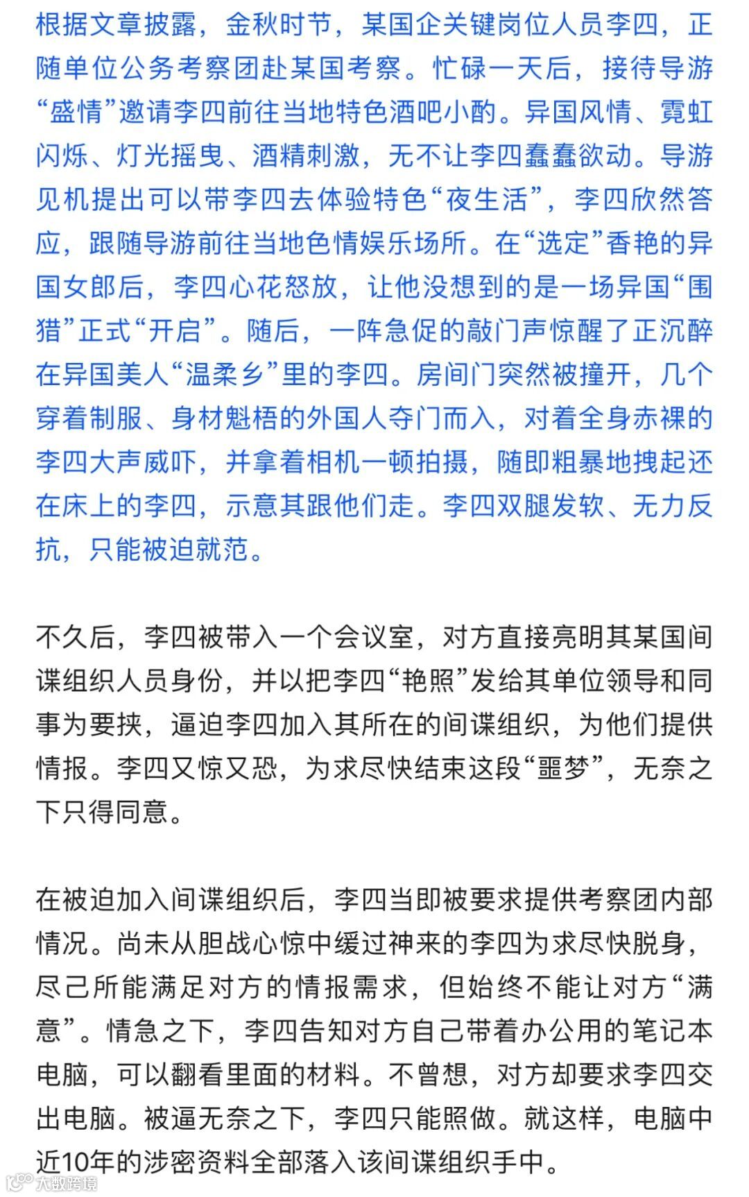 1月23日,国家安全部在一篇题为《猎艳?猎物!》的文章中披露,某国企关键岗位人员李四,赴某国考察期间前往当地色情娱乐场所,后被某国间谍拍照威胁,沦为傀儡,对我国家安全造成了不可估量的危害。最终,李四被依法逮捕,他将面临法律的严正审判。