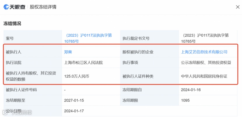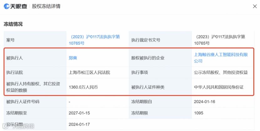 天眼查App显示,近日,郑爽新增两则股权冻结信息,股权被执行企业分别为上海鲸谷座人工智能科技有限公司、上海艾艺信息技术有限公司,冻结股权数额分别为1360万元、125万元,冻结期限自2024年1月16日至2027年1月15日,执行法院均为上海市松江区人民法院。