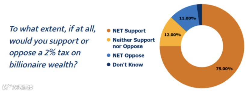 民意调查显示,75%的受访者支持对资产超过1000万美元的人征收2%的财富税;74%的受访者支持对富人征收更高的税,以解决生活成本危机并改善公共服务;54%的人认为,极端财富是对民主的威胁。