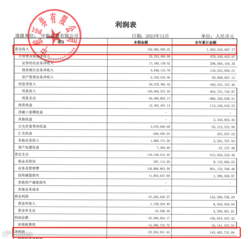 中航证券2023年净利润同比下降