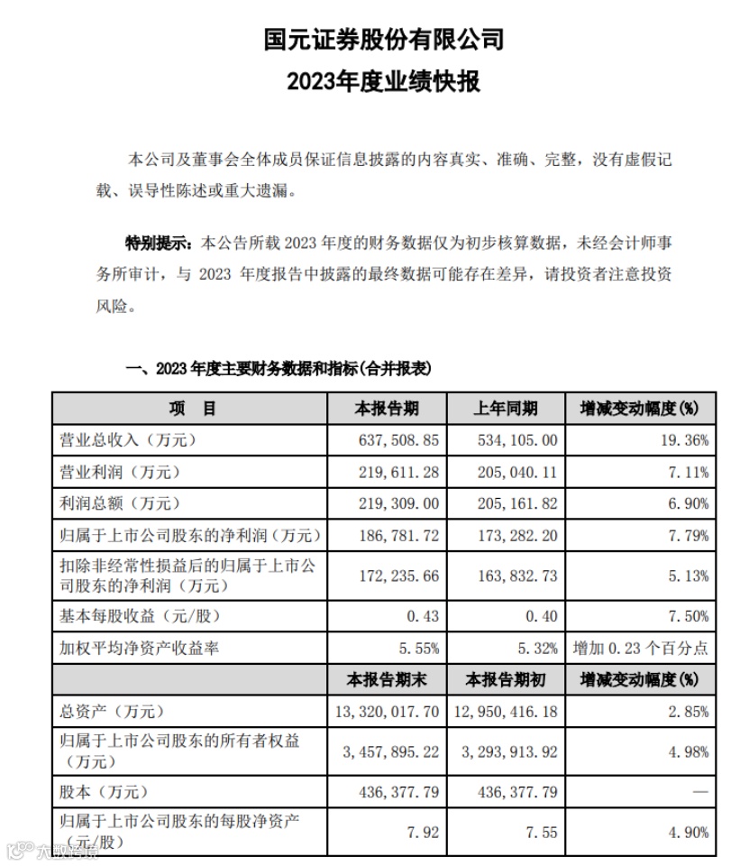 业绩快报显示,国元证券2023年实现营业收入63.75亿元,同比增长19.36%,净利润18.68亿元,同比增长7.79%。