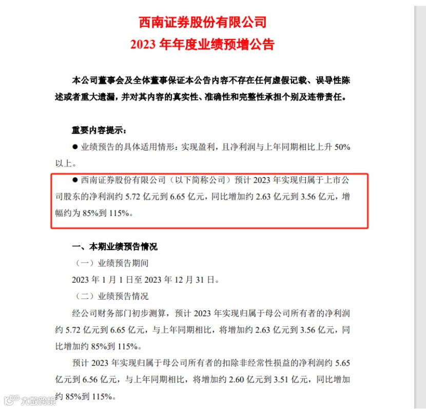 西南证券发布2023 年年度业绩预增公告,经该公司财务部门初步测算,预计2023年实现归属于母公司所有者的净利润约5.72亿元到 6.65亿元,与上年同期相比,将增加约2.63亿元到3.56亿元,同比增加约85%到115%。
