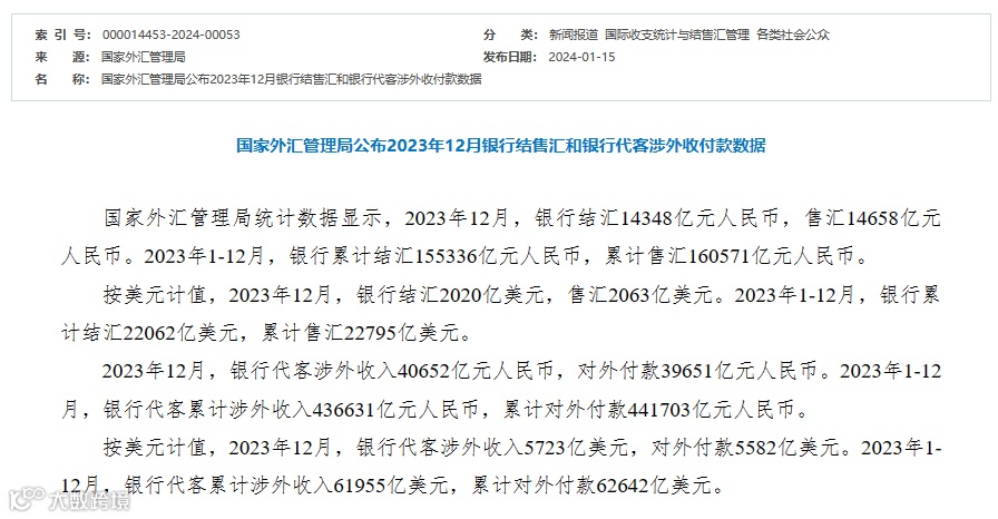 2023年1-12月,银行累计结汇22062亿美元,累计售汇22795亿美元;银行代客累计涉外收入61955亿美元,累计对外付款62642亿美元。