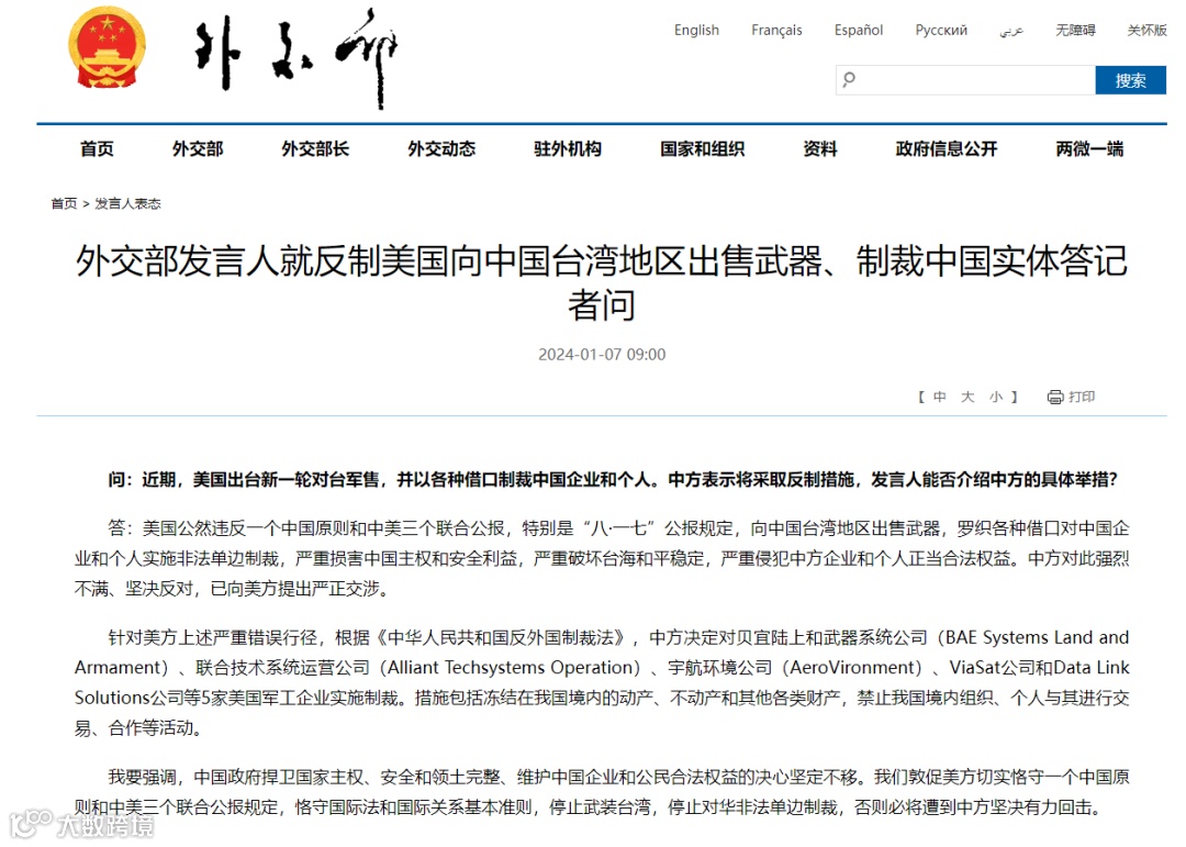 1月7日,据外交部官网消息,外交部发言人就反制美国向中国台湾地区出售武器、制裁中国实体答记者问。