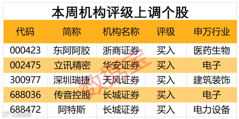 本周机构合计上调5股评级,华安证券上调立讯精密评级至“买入”;浙商证券上调东阿阿胶评级至“买入”;传音控股、阿特斯均获长城证券上调评级。
