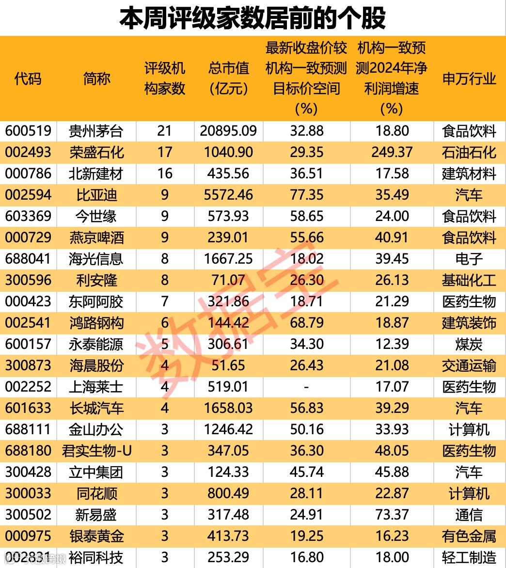 个股方面,21股获3家及以上机构的评级。其中贵州茅台获21家机构评级关注,荣盛石化、北新建材有超10家机构评级。