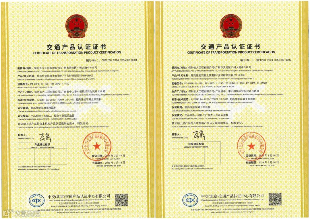 近日,由保利长大自研自产的超高性能混凝土(UHPC)预混料,顺利通过中交(北京)交通产品认证中心(CCPC)认证,成为UHPC预混料生产领域“全国首家”。