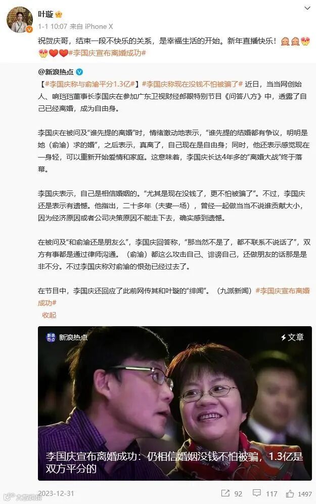 2023年12月31日,李国庆官宣离婚平分1.3亿的消息曝光。1月1日,叶璇还特地转发相关消息喊话李国庆:“祝贺庆哥,结束一段不快乐的关系,是幸福生活的开始。新年直播快乐!”