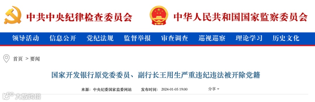 据中央纪委国家监委网站,经中共中央批准,中央纪委国家监委对国家开发银行原党委委员、副行长王用生严重违纪违法问题进行了立案审查调查。