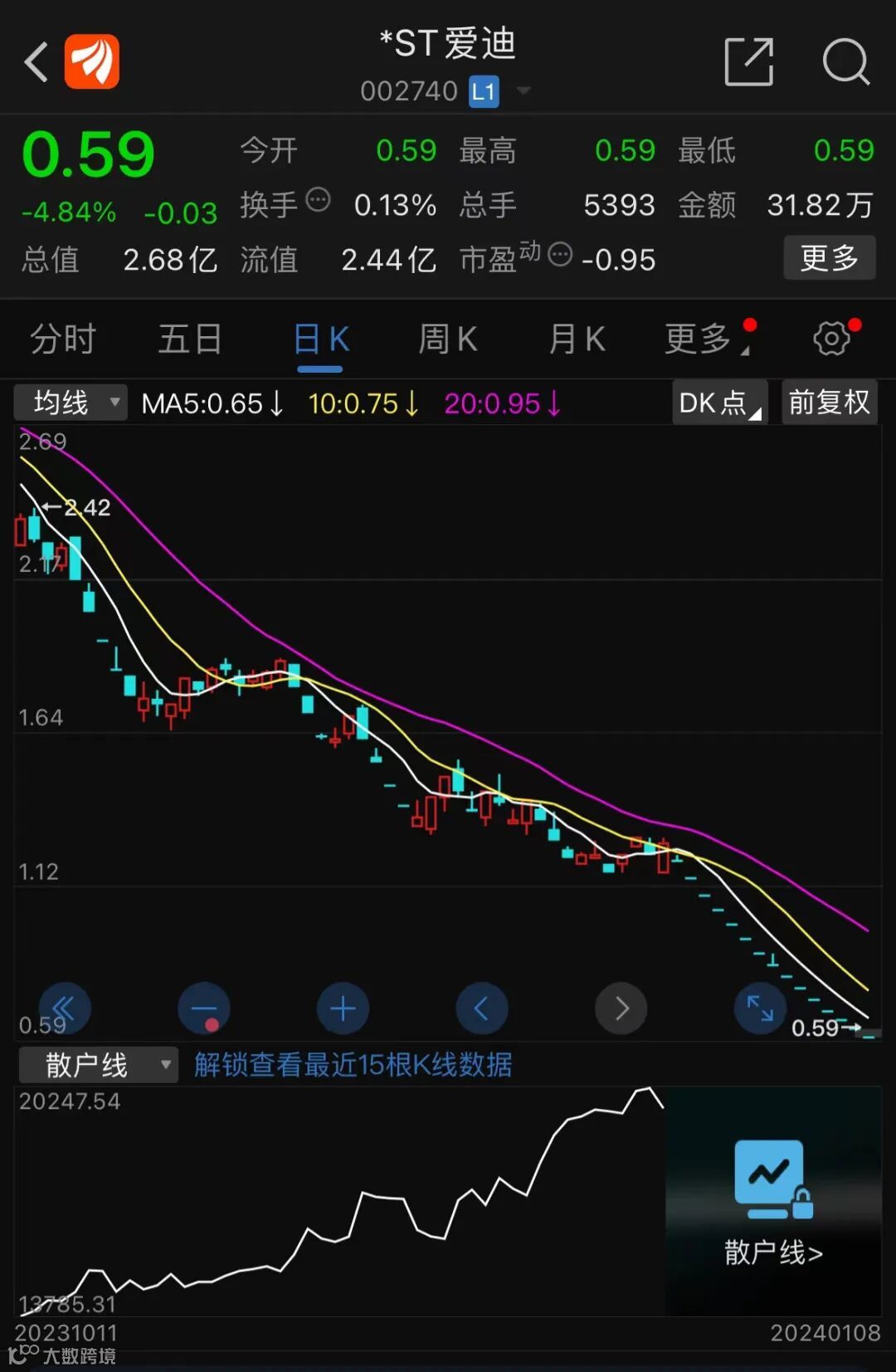1月8日开盘,昔日“深市珠宝第一股”*ST爱迪一字跌停,股价报0.59元,该股票收盘价已连续11个交易日低于1元/股。