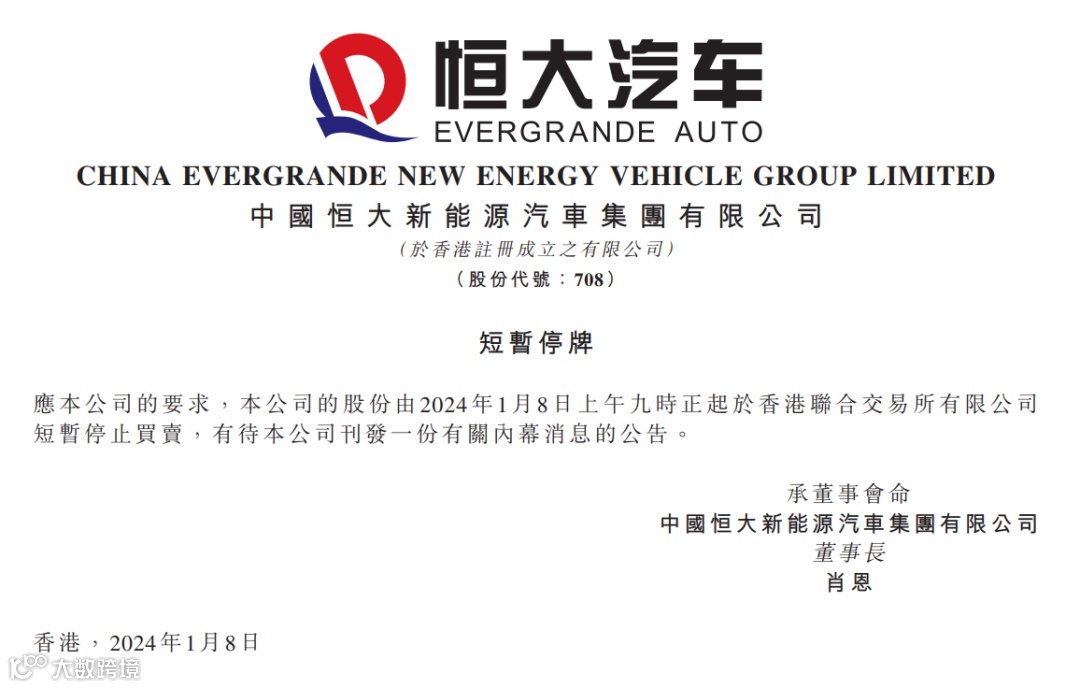 1月8日开盘前,中国恒大新能源汽车集团有限公司(简称“恒大汽车”)在港交所发布公告,该公司股份将于星期一上午9时整起短暂停止买卖。