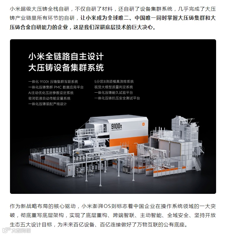 小米超级大压铸全栈自研,不仅自研了材料,还自研了设备集群系统,几乎完成了大压铸产业链里所有环节的自研,让小米成为全球唯二、中国唯一同时掌握大压铸集群和大压铸合金自研能力的企业。