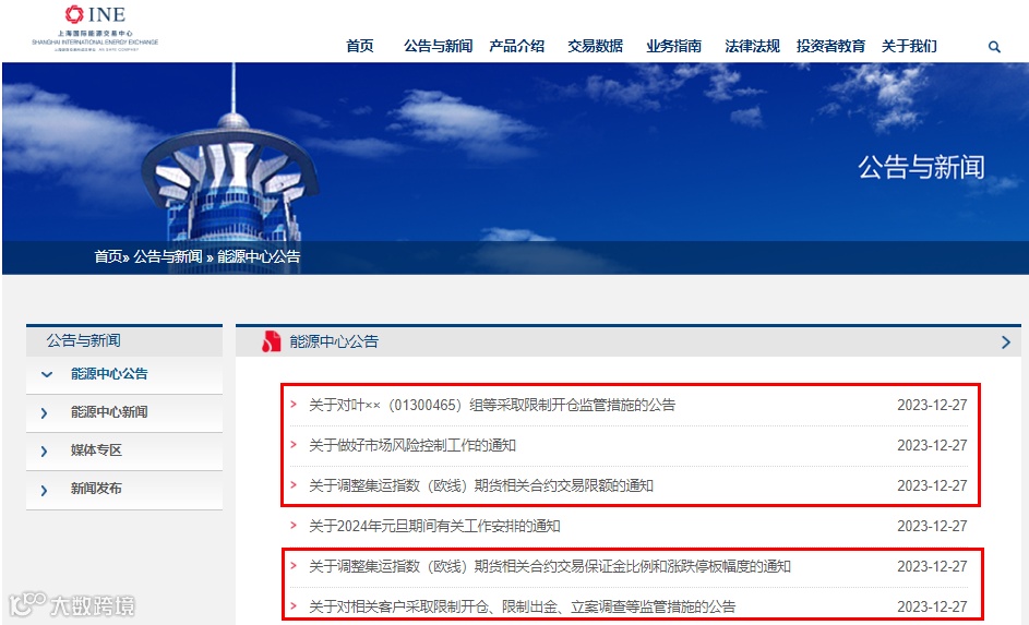 值得注意的是,上期能源又最新公告,因在集运指数(欧线)期货相关合约上日内交易量超限,对叶××(01300465)组等采取限制开仓监管措施。