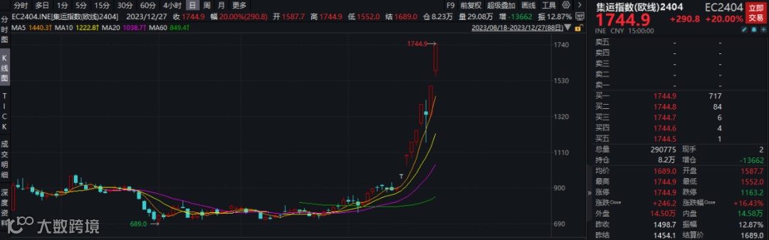 12月27日,集运指数(欧线)期货延续强势。主力EC2404合约开盘后很快冲高涨停,午后期价一度回落,但收盘前又重新封住涨停板,最终收报1744.9点,涨幅为20%。EC2404合约继周二后连续第二个交易日涨停,12月以来涨幅已达112%。