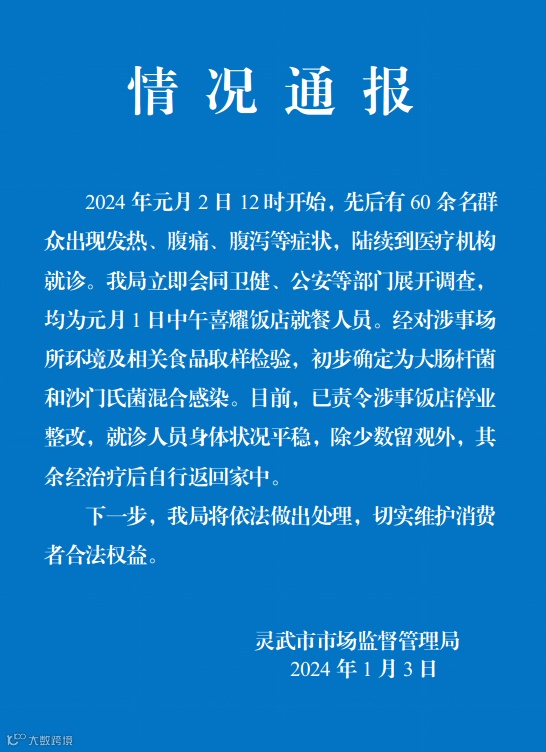 1月3日22时许,宁夏灵武市市场监督管理局通报:1月2日12时开始,先后有60余名群众出现发热、腹痛、腹泻等症状,陆续到医疗机构就诊。