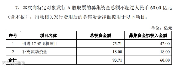 具体为,中国国航拟向控股股东中航集团定增募资不超60亿元,用于引进17架飞机项目及补充流动资金。此外,拟向中航有限发行H股股票,募资总额不超过20亿港元。