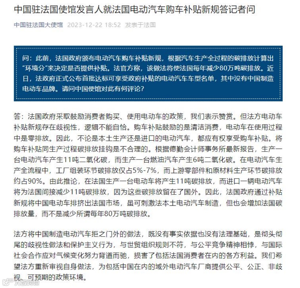 另外,近日,法国政府正式公布首批达标可享受政府补贴的电动汽车车型名单,其中没有中国制造电动车品牌。对此,12月22日晚间,中国驻法国使馆发言人表示,法国政府通过补贴新规将中国电动车排挤出法国市场的做法,是彻头彻尾的歧视性做法和保护主义行为,与国际社会合作应对气候变化努力背道而驰。