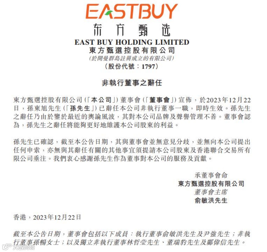东方甄选12月22日晚间在港交所公告称,12月22日,孙东旭已辞任公司非执行董事一职,即时生效。孙东旭的辞任是鉴于最近的舆论风波,其对公司品牌及声誉管理不善。东方甄选事会认为,孙东旭的辞任,将能够更好地维护公司股东的利益。