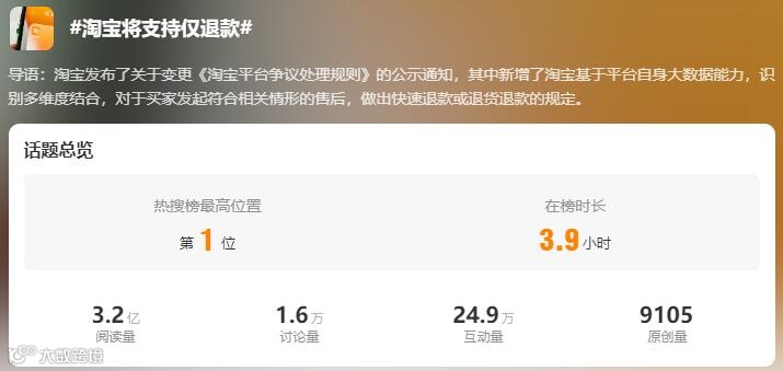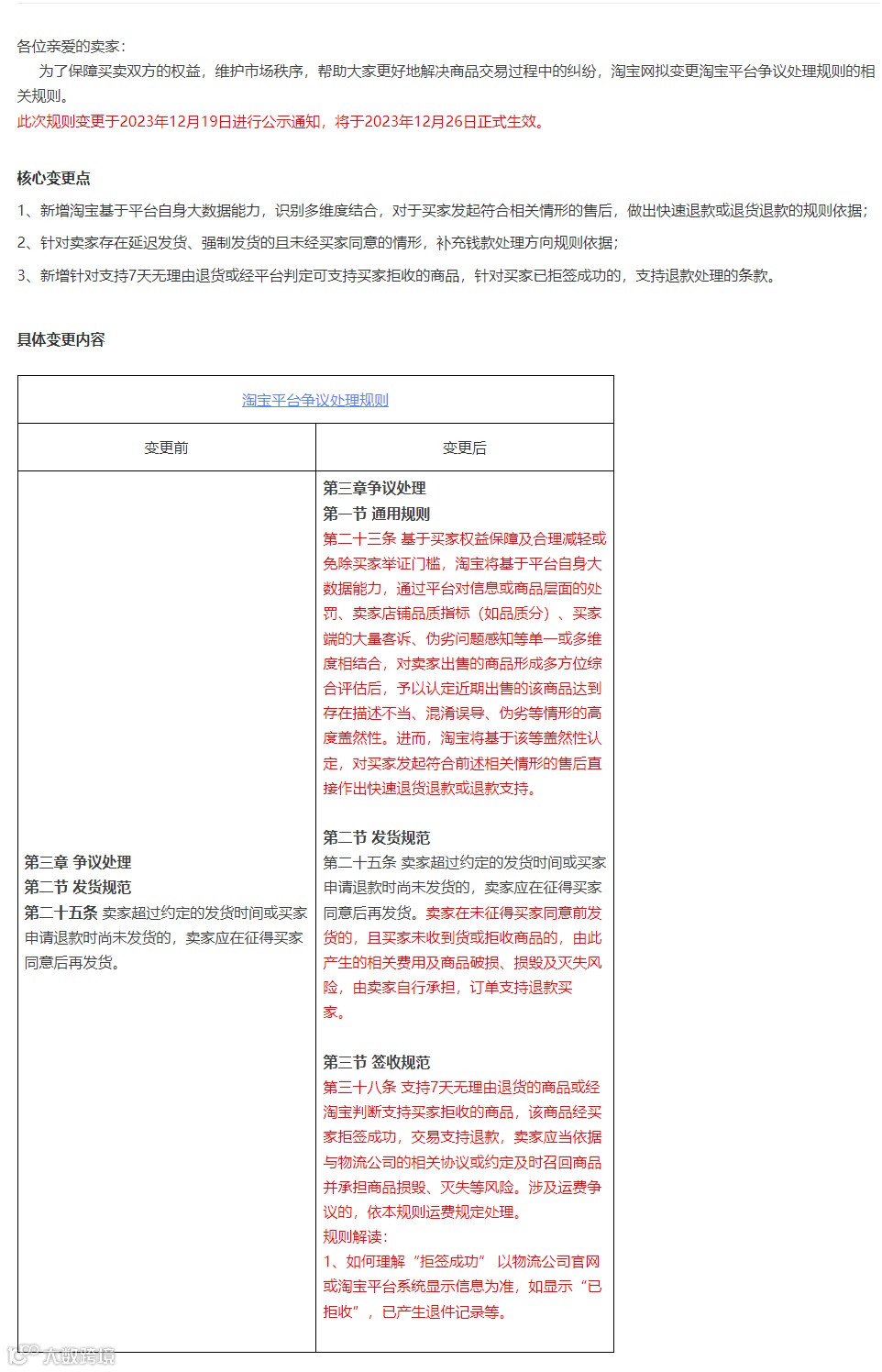 12月27日,话题#淘宝将支持仅退款#冲上热搜第一,引发不少网友热议。12月25日下午,淘宝在其官网发布了关于变更淘宝平台争议处理规则的公示通知,此次规则变更于12月26日正式生效。