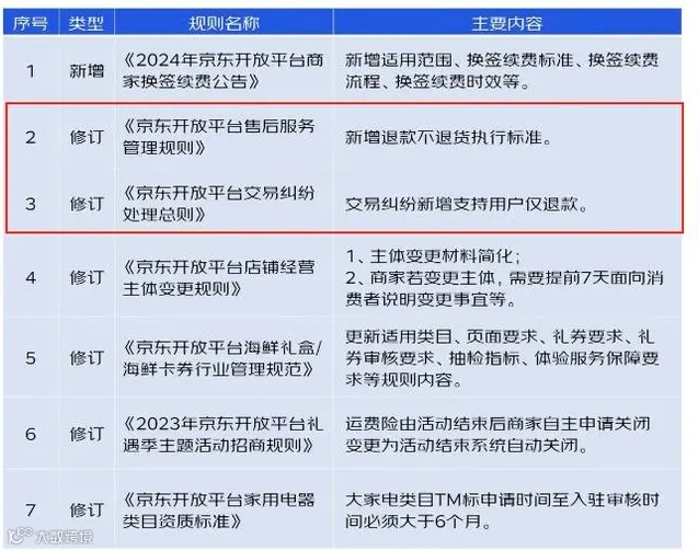 12月27日,京东平台规则网站显示,京东近期修订《京东开放平台交易纠纷处理总则》,主要内容为交易纠纷新增支持用户仅退款。该模式为消费者无需返还原商品,退款完成后,将不能对此商品再次发起退货申请。此外,《京东开放平台售后服务管理规则》也新增退款不退货执行标准。