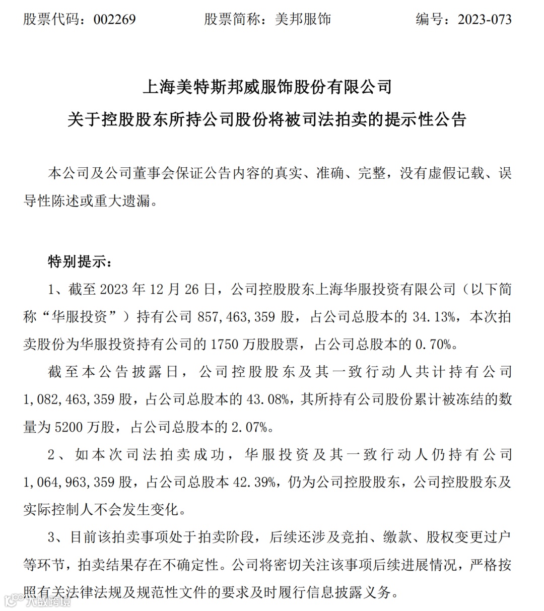 另外,美邦服饰于近日通过淘宝网司法拍卖网络平台查询获悉,公司控股股东华服投资所持公司1750万股股票将被司法拍卖。截至2023年12月26日,华服投资持有公司8.57亿股,占公司总股本的34.13%。公司控股股东及其一致行动人共计持有公司10.82亿股,占公司总股本的43.08%。