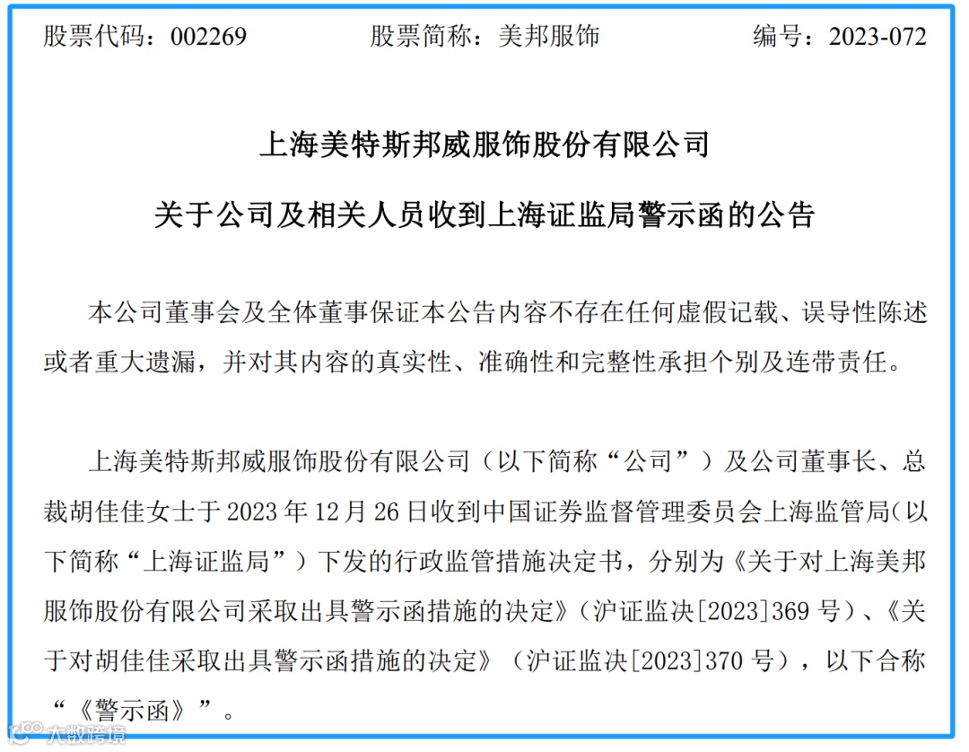 美邦服饰(002269)12月26日晚公告,公司及公司董事长、总裁胡佳佳于12月 26日收到上海证监局下发的行政监管措施决定书。