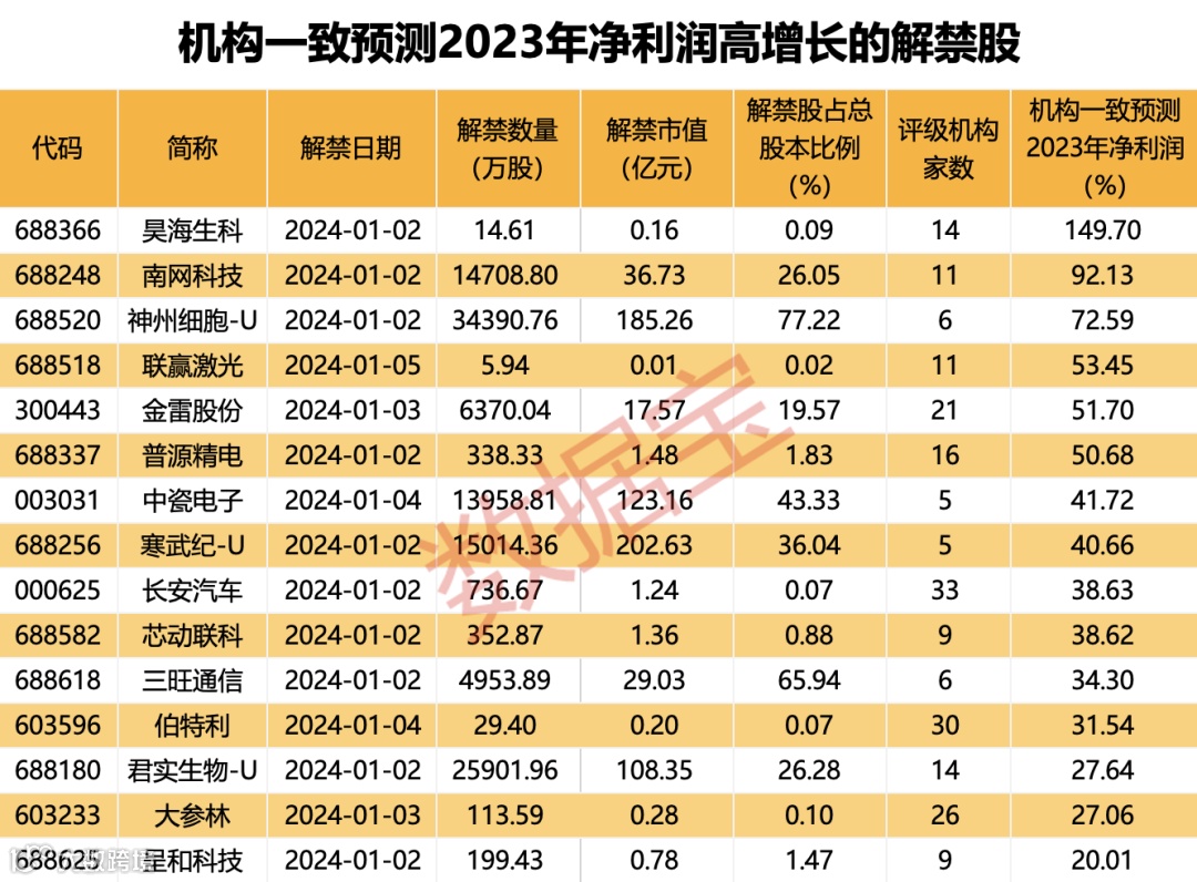 按照5家及以上机构一致预测,有15只解禁股的2023年业绩有望超20%增长,昊海生科、南网科技、神州细胞-U、联赢激光、金雷股份、普源精电的机构一致预测2023年净利润增幅均超50%。