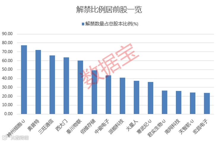 神州细胞-U的解禁规模次之,下周将有3.44亿股上市流通,解禁股主要为首发原股东限售股份,解禁市值达185.26亿元。