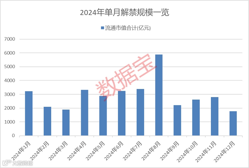 证券时报·数据宝梳理,2024年,解禁股数量较多的月份为1月和6月,分别有224股和191股面临解禁。以解禁规模来看,8月和7月两个月是解禁市值规模较大的两个月,分别有5887.65亿元和3375.53亿元的市值将上市流通。