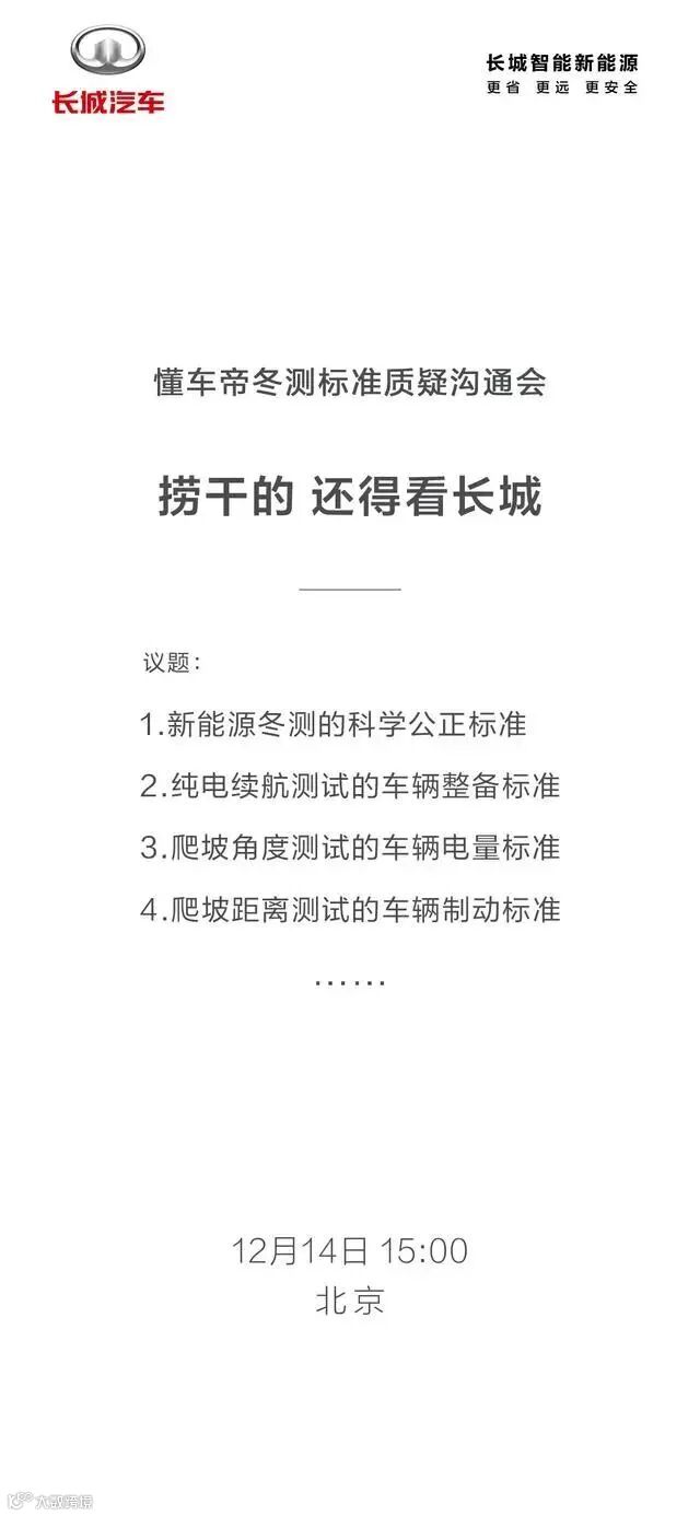 长城汽车宣布举行懂车帝冬测标准质疑沟通会