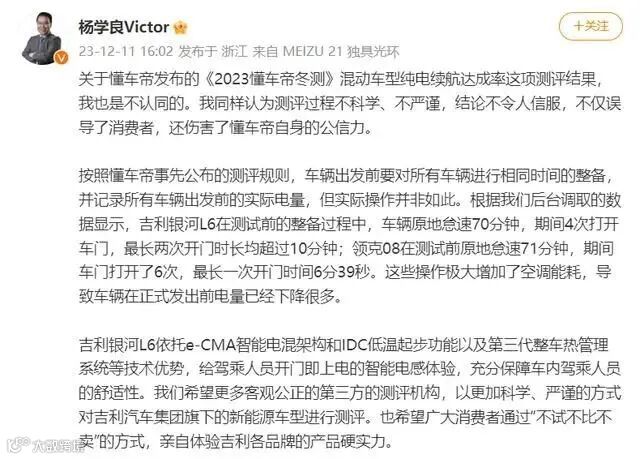 今日下午,吉利集团副总裁杨学良也发文回应懂车帝冬测: