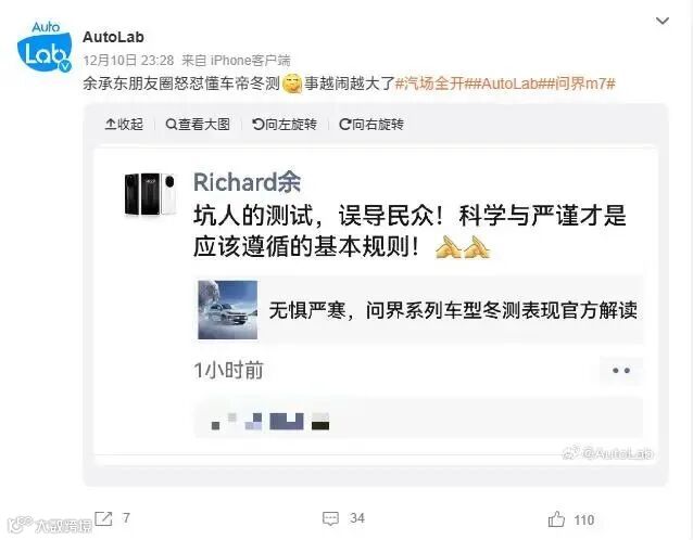 值得一提的是,此前余承东在微信朋友圈就问界M7参与《2023 懂车帝冬测》的测试结果进行表态:坑人的测试,误导民众!科学与严谨才是应该遵循的基本规则!