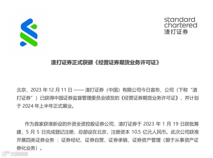 券商中国记者获悉,12月11日,渣打证券(中国)有限公司已经获得证监会颁发的《经营证券期货业务许可证》,并计划于2024年上半年正式展业。