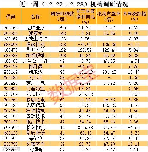迈瑞医疗机构关注度最高,合计390家机构调研了该股,其中包括了70家基金、33家证券公司、60家私募、13家险资以及126家海外机构等。
