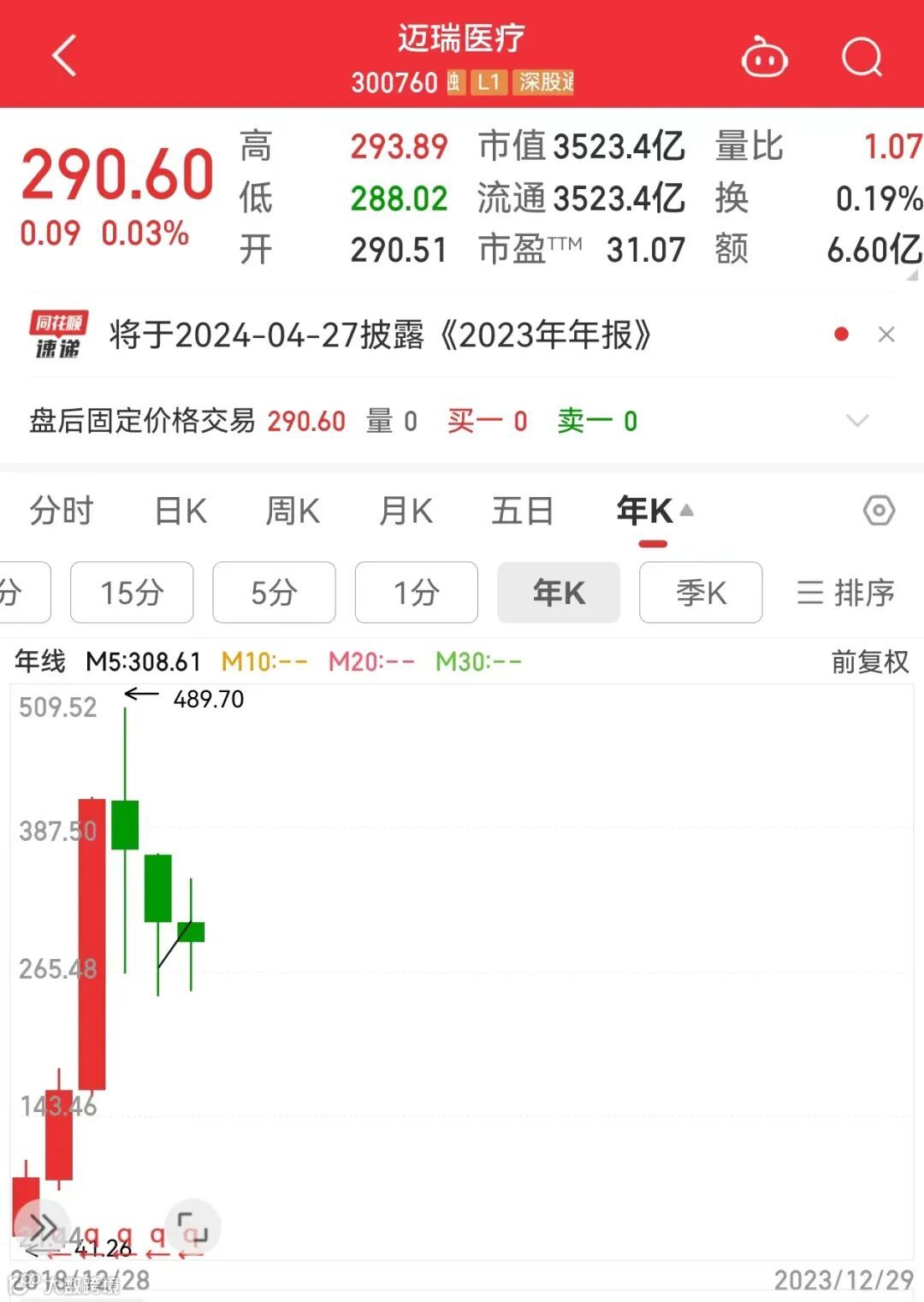 迈瑞医疗是A股超级大白马,过去几年业绩持续高增长,且持续高分红,最新市值超过3500亿元。在今年大白马大幅调整的背景下,迈瑞医疗表现抗跌,年内跌幅5.29%。