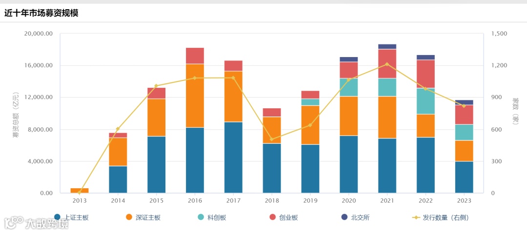 据Wind数据统计,按照上市日期口径,2023年A股市场包含IPO、增发和配股等多种方式的全口径股权融资事件共818起,较2022年同比减少近17%,合计募集金额为11344.30亿元,同比下降32.8%。