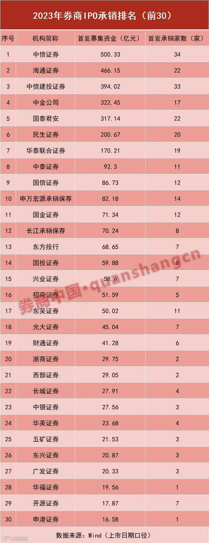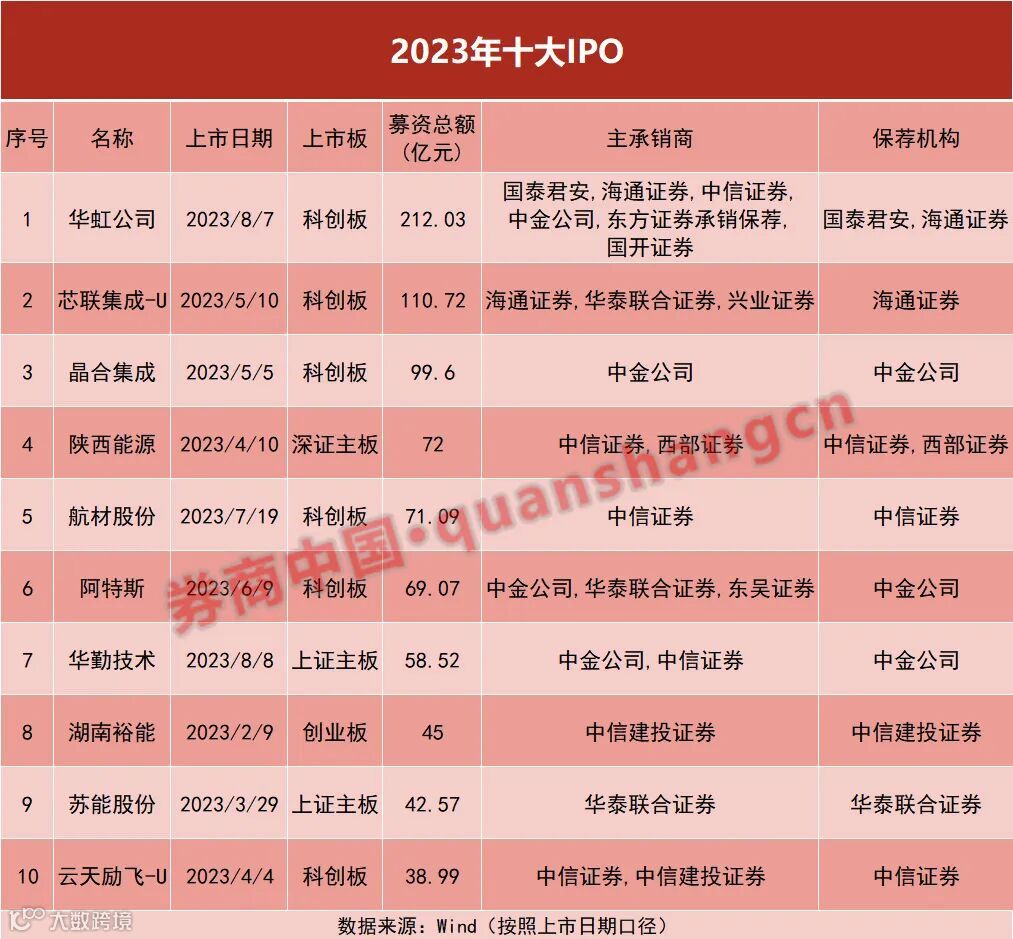 此外,前十名中还包括中泰证券、国信证券、申万宏源承销保荐,IPO承销规模均超80亿元。