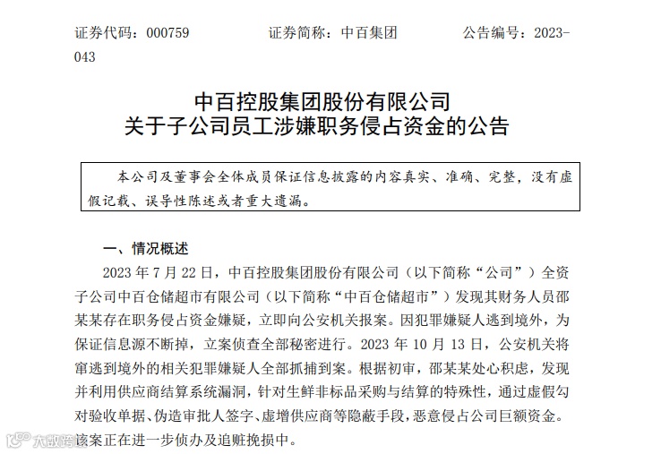 公告显示,2023年7月22日,中百集团全资子公司中百仓储超市有限公司(以下简称“中百仓储超市”)发现邵某某存在职务侵占资金嫌疑,立即向公安机关报案。