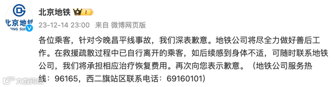 当晚23时,@北京地铁 发布微博致歉:各位乘客,针对今晚昌平线事故,我们深表歉意。地铁公司将尽全力做好善后工作。在救援疏散过程中已自行离开的乘客,如后续感到身体不适,可随时联系地铁公司,我们将承担相应治疗恢复费用。再次向您表示歉意。