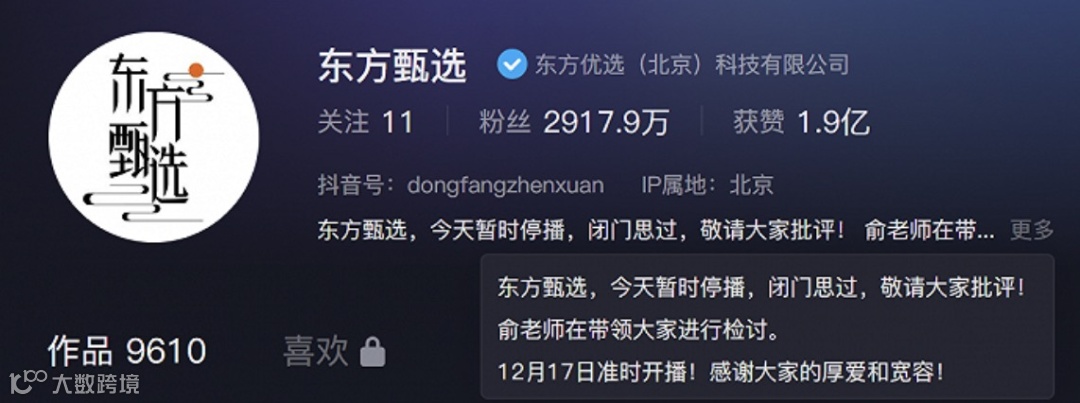 12月16日凌晨,东方甄选官方抖音账号更新简介,宣布当天暂时停播:“闭门思过,敬请大家批评!俞老师在带领大家进行检讨。12月17日准时开播,感谢大家的厚爱和宽容!”