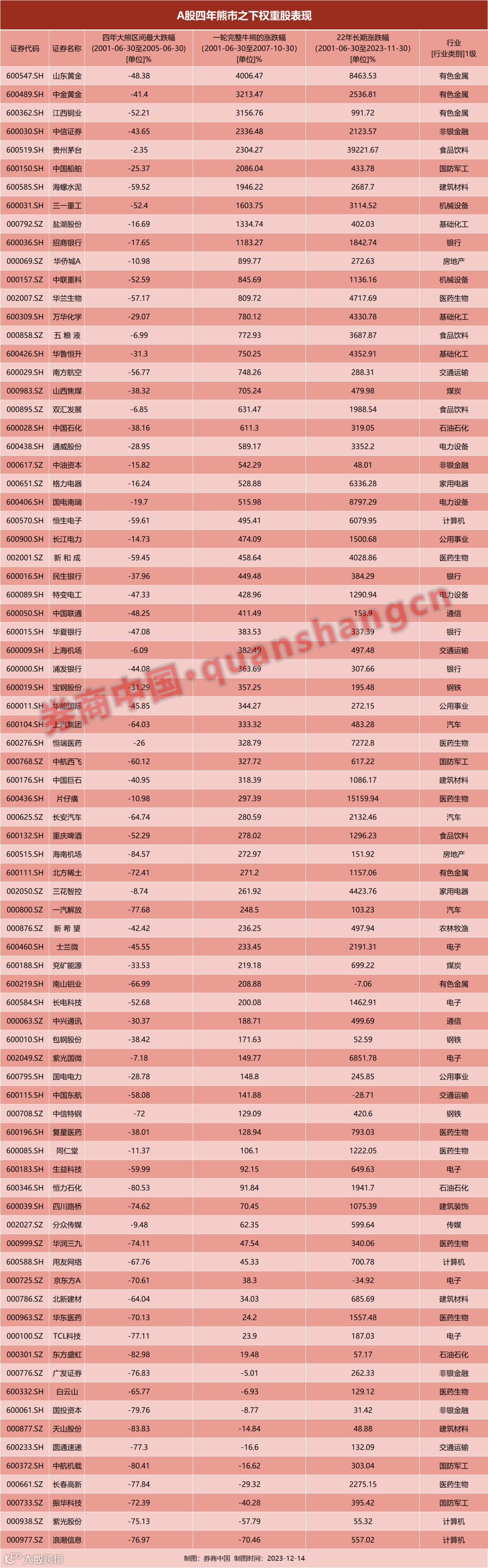 熬过一轮熊市,在接下来的一轮牛市中,73%的权重股不仅收复了四年大熊的失地,而且在7年的时间中涨幅超过1倍,7年的年化收益超过10%。但也有9只沪深300成份股没有成功收复四年熊市失地,占比接近10%。